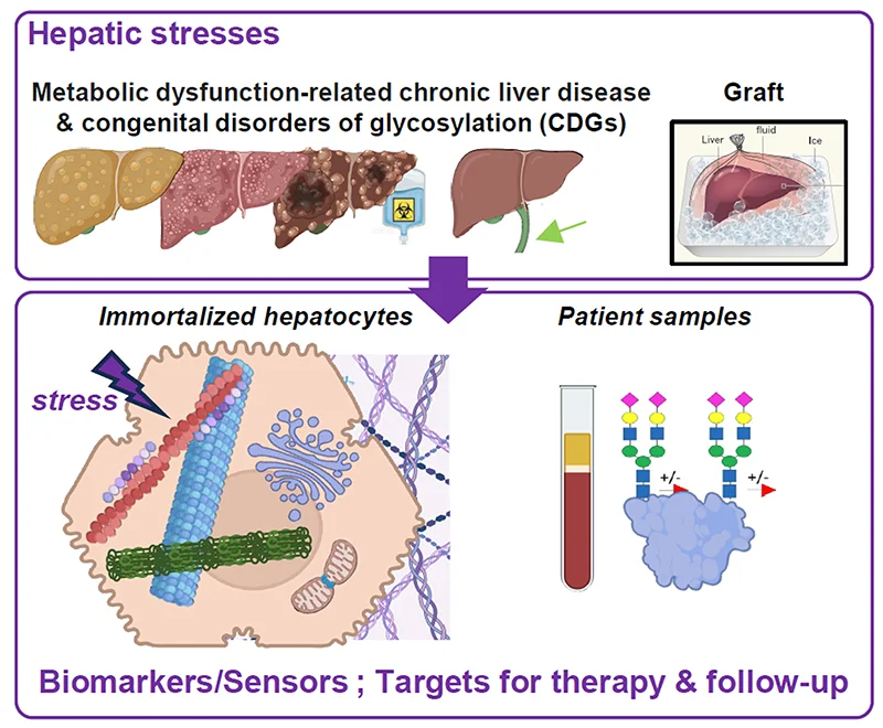 Par des approches cellulaires, nous explorons l’effet de stress hépatocytaires sur les éléments du cytosquelette et la glycosylation de protéines circulantes. Le but est d’identifier des cibles thérapeutiques et des biomarqueurs précoces de souffrance cellulaire dans les maladies stéato-fibrosantes et lors de la conservation des greffons hépatiques.