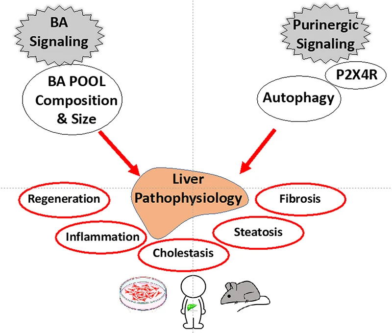 Au cours de la réparation du foie, les fonctions hépatiques doivent être maintenues pour préserver l’intégrité de l’organe et l’homéostasie de l’individu. Ceci est particulièrement crucial pour la sécrétion biliaire, dont la dérégulation entraîne une surcharge de l’organisme en acides biliaires (AB) avec ses conséquences toxiques sur le parenchyme hépatique. Les mécanismes de régulation de l’homéostasie biliaire au cours de la réparation du foie sont encore mal connus. La littérature ainsi que nos résultats indiquent que le système purinergique d’une part, ainsi que les AB d’autre part contribuent significativement à la régulation des processus de régénération cellulaire, de l’homéostasie biliaire, de la stéatogénèse et de la fibrogénèse au cours de la réparation du foie. Les deux axes scientifiques de nos projets sont :